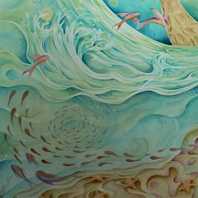 The moon appears high in the earthly sky, she pulls on the oceans creating tidal rhythms and influencing the life cycles of creatures that reside beneath the waves. Upon the land which rises above the ocean Moonflowers embrace the moonlit night sky. They bloom wondrously in the darkness, holding onto the night. As the sun appears over Earth's horizon chasing away the lunar light, the moon travels on stirring change in her wake.