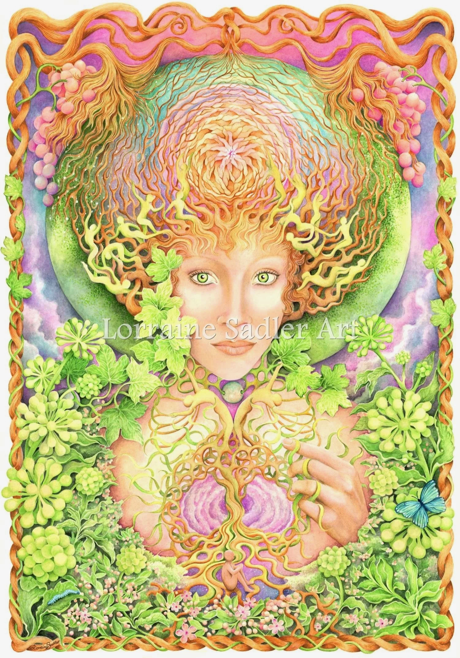 Within this painting I explore the journey of a human spirit and the interconnectedness of all life. A Gaia-like goddess represents a creator weaving the web of life. At the same time she is a personification of earth itself - the embodiment of an enigmatic essential essence breathing life into being.